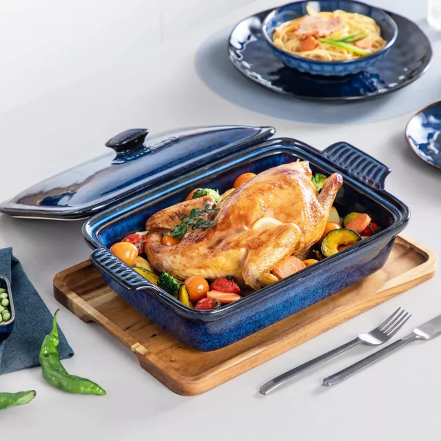 Elevate your everyday cooking with this stunning blue stoneware casserole dish. Designed with kiln-fired craftsmanship, it boasts a mesmerizing texture and glossy finish that makes every piece one-of-a-kind. Not only does it deliver exceptional performance, but it also doubles as a beautiful centerpiece on your dining table. With its generous size and versatile lid, this baking dish is perfect for hearty family meals, special gatherings, or simple weeknight dinners.
